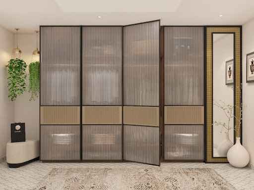 Wardrobes with hinged doors offer organized storage for clothes, shoes, and accessories.